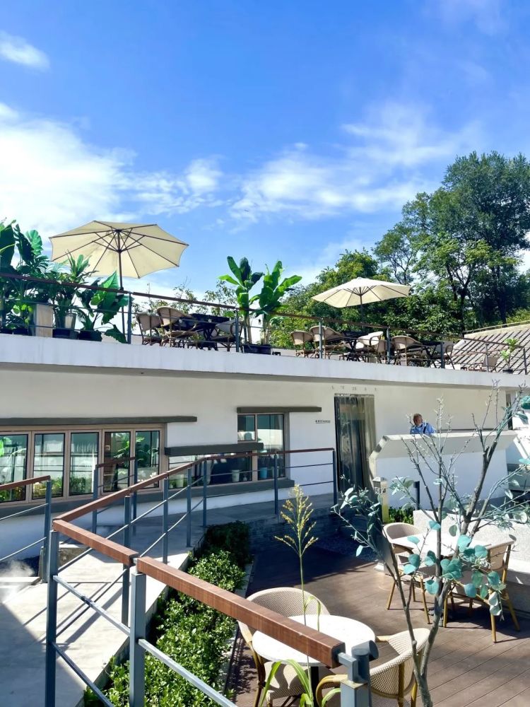 整个餐厅都是白色的外墙,内部是简约浪漫的法式装修,在顶楼露台可以看到屋顶的中式瓦房设计,融合出别样格调。在露台上小坐,抬头就是蜿蜒不见尽头的长城,会让你切实体会诗词中的感叹“历数风烟千载远,长城依旧卧山头”。