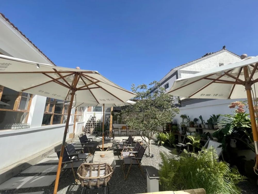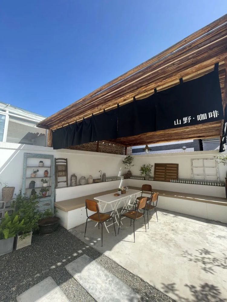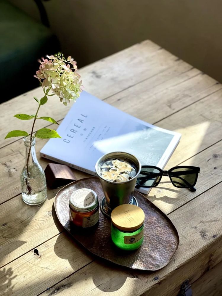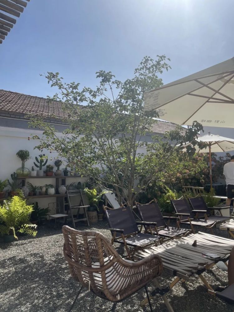屋内穿过咖啡制作的房间就是一个小院,被老板打理得格外有趣。小院的中央是遮阳伞下的几组桌椅,绿植鲜花相映成趣,妥妥的露营风。小院的北侧是一个三开间的室内用餐区,房间内的设计是简朴的乡村复古风,摆设和家具都是主理人精心从各个渠道淘来的,非常有格调。