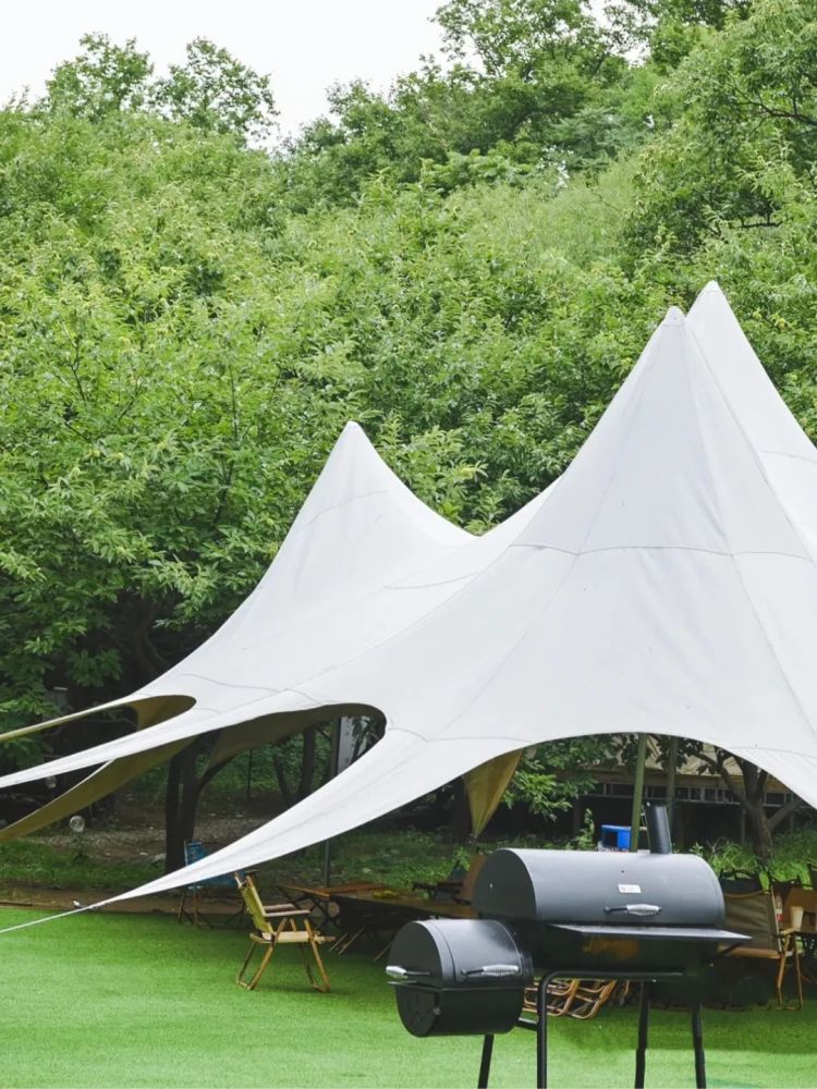 营地中心区是一个可以容纳百人的天幕广场,在里可以用餐,发呆、还有晚间的露天电影,其中网红小熊座咖啡厅也在这里, 它满足你的早C晚A,可以将与森林为伴,和繁星共饮同时拥有。