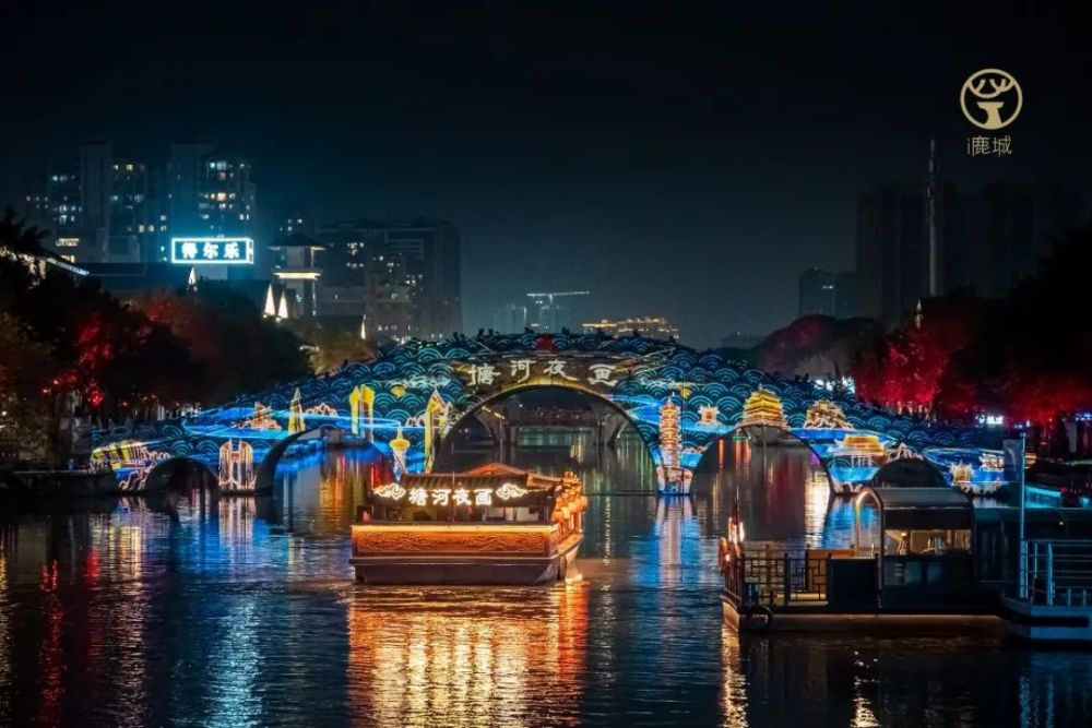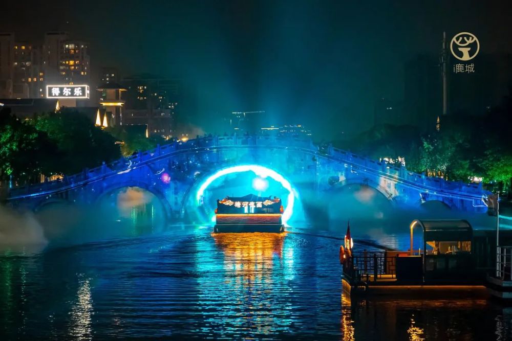 塘河两岸缭绕的云雾与绚丽的灯光构建出一片梦幻仙境,仿佛掉入时光卷轴,一幕幕经典故事上演,带游客穿梭千年。