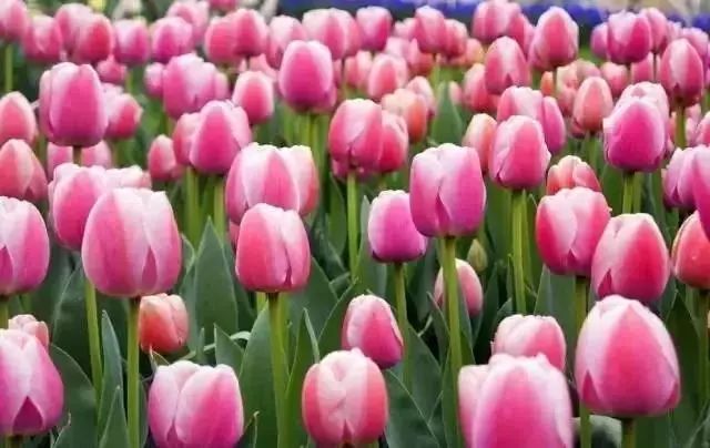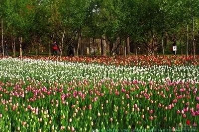 走进郁金香园,举目望去,大片大片的郁金香在暖风的吹拂下竞相开放,在阳光的照射下,五颜六色的花朵娇艳绚丽,芬芳吐蕊,令人陶醉。