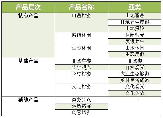 山地旅游产品开发思路要以提升观光旅游产品,做好旅游产品开发、完善及升级;深化度假旅游产品,龙头带动,优势利导;深度开发休闲度假产品,促进旅游产业向休闲度假升级;创新特色旅游产品,加快复合产品的设计和非观光产品的开发。绿维文旅对现有旅游区(点)及支撑资源进行系统归类,形成具有针对性的旅游产品体系,最终形成十大类旅游产品,即三个核心产品,四个基础产品,三个辅助产品。详见表。