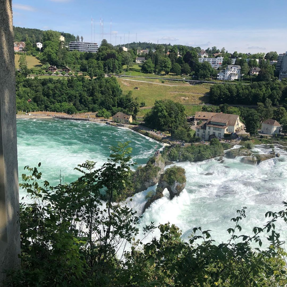 莱茵瀑布原来是冰河时期的产物,身为欧洲第一大瀑布,宽度约150米,落差达 23 米,气势澎拜壮观,从视觉以及听觉而言都震撼难喻,漫步于观光步道,沁凉感袭来;而莱茵瀑布中央,伫立著两大块岩石,其中一个上面插著瑞士国旗随风摇曳,游客更可登上阶梯享受居高临下之感。