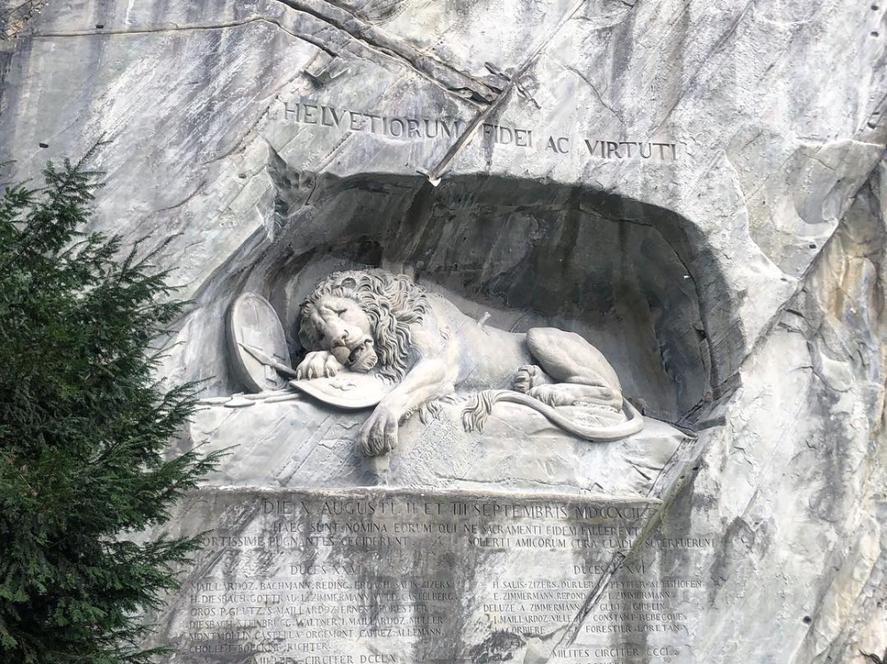 在冰河公园旁有个纪念碑,是隻负伤垂危的狮子雕像,由丹麦雕塑家于花岗岩石上设计,用以纪念在1792年保卫巴黎杜伊勒里宫的战斗中,那1000多名的瑞士僱佣兵,雕像上的拉丁文意思为献给忠诚和勇敢的瑞士,而狮子右前爪的两面盾牌上,分别有象徵瑞士的十字徽章以及法国王室的香根鸢尾标记,如此有张力的艺术雕刻,确实会触动心弦,否则美国作家马克·吐温也不会评其为世上最感动人的雕像。