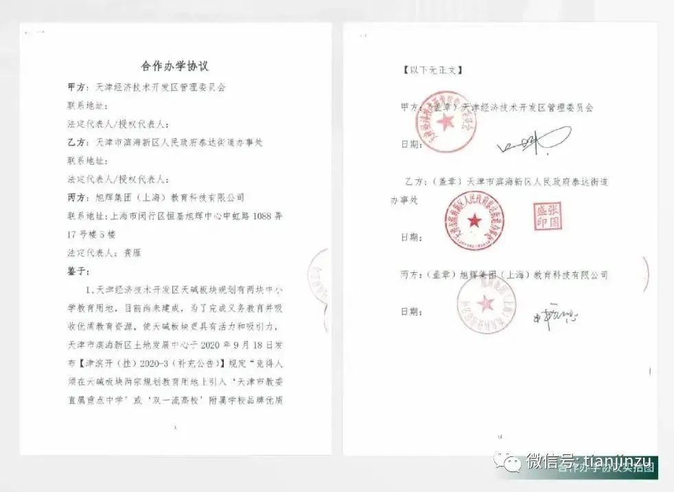 2021年4月7日,天津经济技术开发区管委会,天津滨海新区泰达街道办事处及旭辉教育三方正式签署华东师范大学附属(天津)中旭学校合作办学协议。