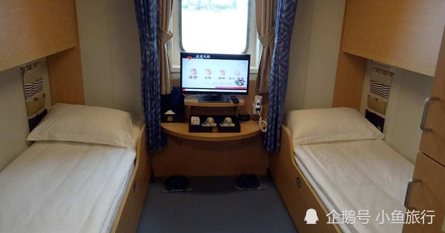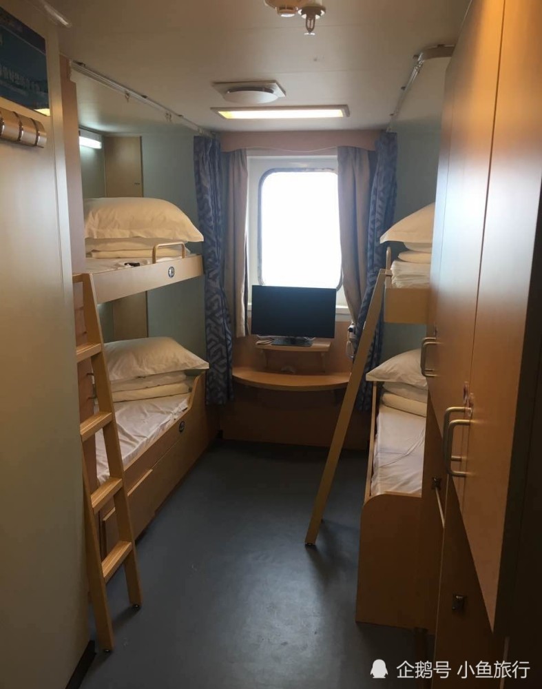 2、长乐公主号邮轮海景房,海景房分为海景房双人间和海景4人间,分布在邮轮的5层或6层,其中2人间为2张平铺单人床,窗型为圆窗;4人间为2组上下铺,窗型为方窗,房间面积都为13平方米。