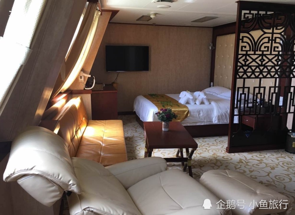 3、长乐公主号邮轮豪华海景套房,分布在邮轮的6层,房间面积为26平方米,窗型为方窗,豪华海景套房含3扇海景窗、独卫、洗漱盆、电冰箱、1.5M大床、电视机、写字台、衣柜、沙发、茶几、行李架,可以同时入住1-2人。