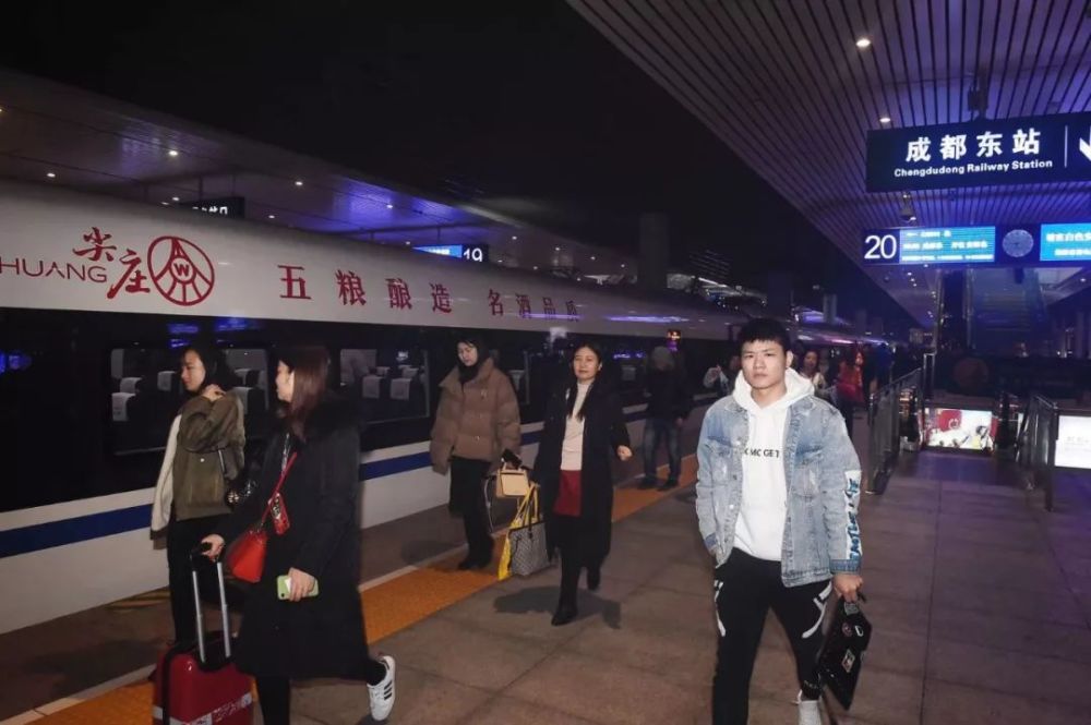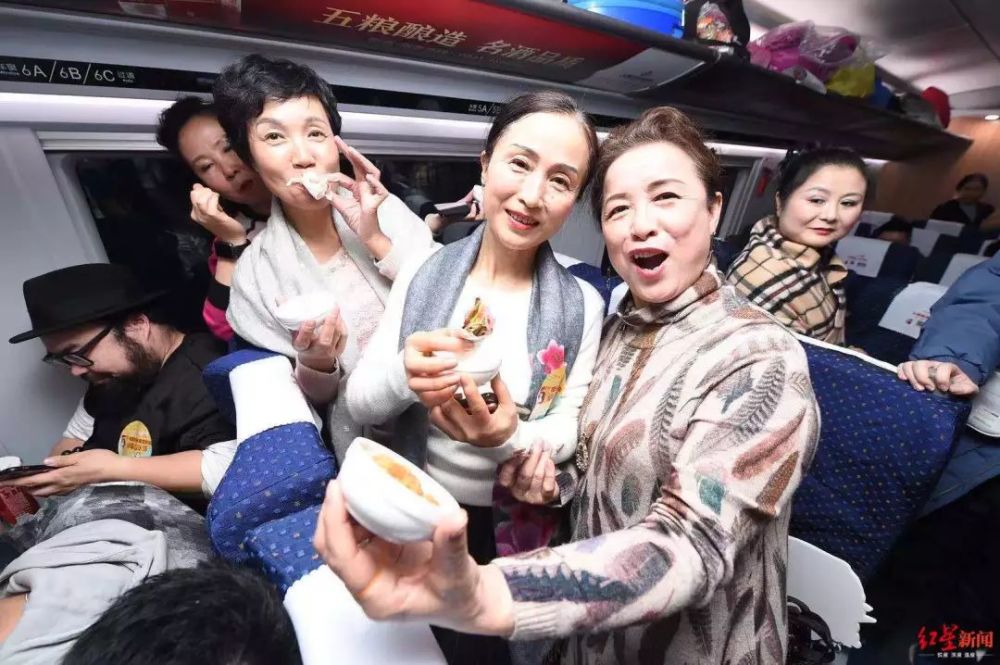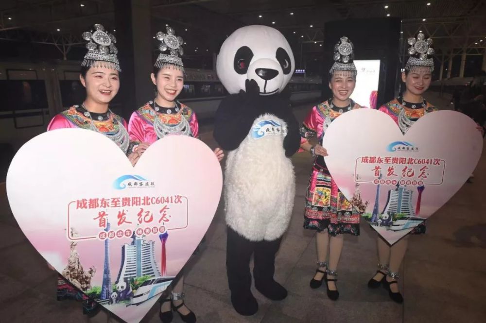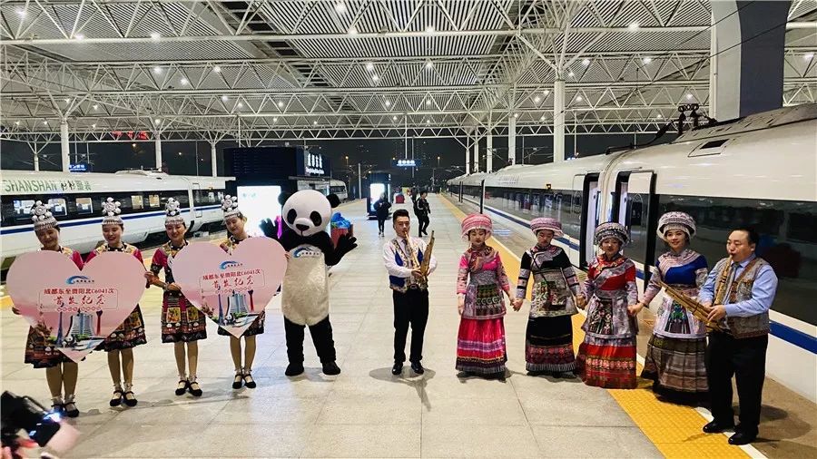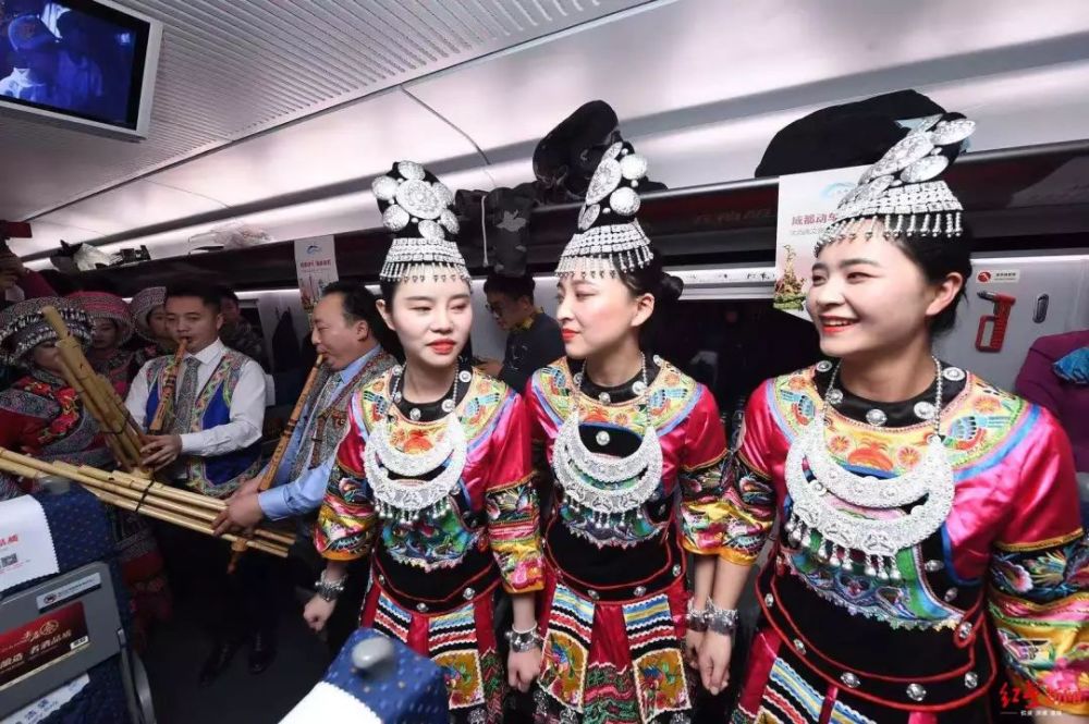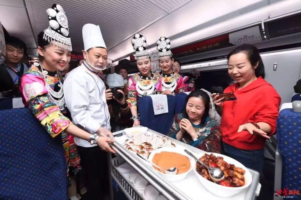 成贵高铁首发从成都东站始发至贵阳北站,车上贵阳特色美食与民族舞蹈吸引乘客驻足围观。