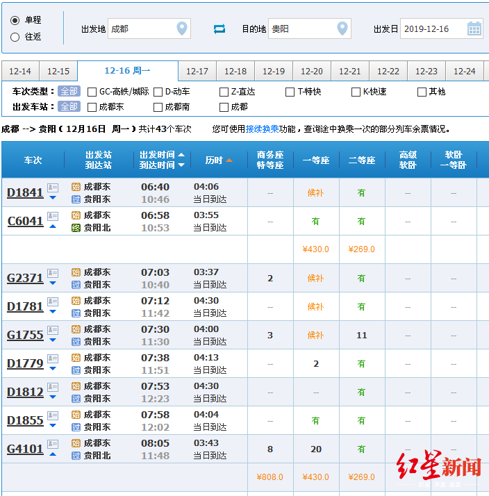 记者通过12306看到,从12月16日起,成都至贵阳间动车将于早上6:58分从成都东开出,最晚一趟列车为下午18:55从成都南开出。车票价格二等座最低269元,最高票价294元。一等座票价最低430元,一等座票价最高470元。