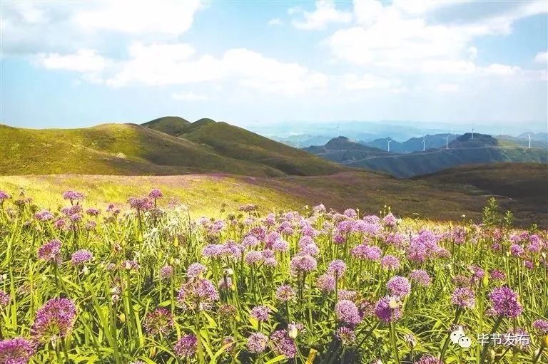 韭菜坪有云上花海之称,又名“毕节赫章阿西里西韭菜坪”,位于毕节赫章县兴发乡,国家 4A 级旅游景区。阿西里西韭菜坪是全国唯一的野生韭菜花保护区、“中国野生韭菜——多星韭之乡”,是目前已知的世界上最大面积的野生韭菜花带,被誉为“地球的蓝宝石、东方的普罗旺斯”。