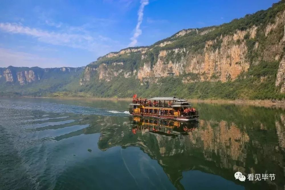 乌江源百里画廊位于毕节黔西县和织金县的交界处。乌江从毕节高峡深谷、崇山峻岭中一路奔腾咆哮,在大鹏展翅崖壁景观下呈现出两源交汇的壮美景观,景色秀丽,融高峡、平湖、溶洞、飞瀑等景色为一体,素来被誉为“山似三峡而水胜三峡,水似漓江而山胜漓江”。