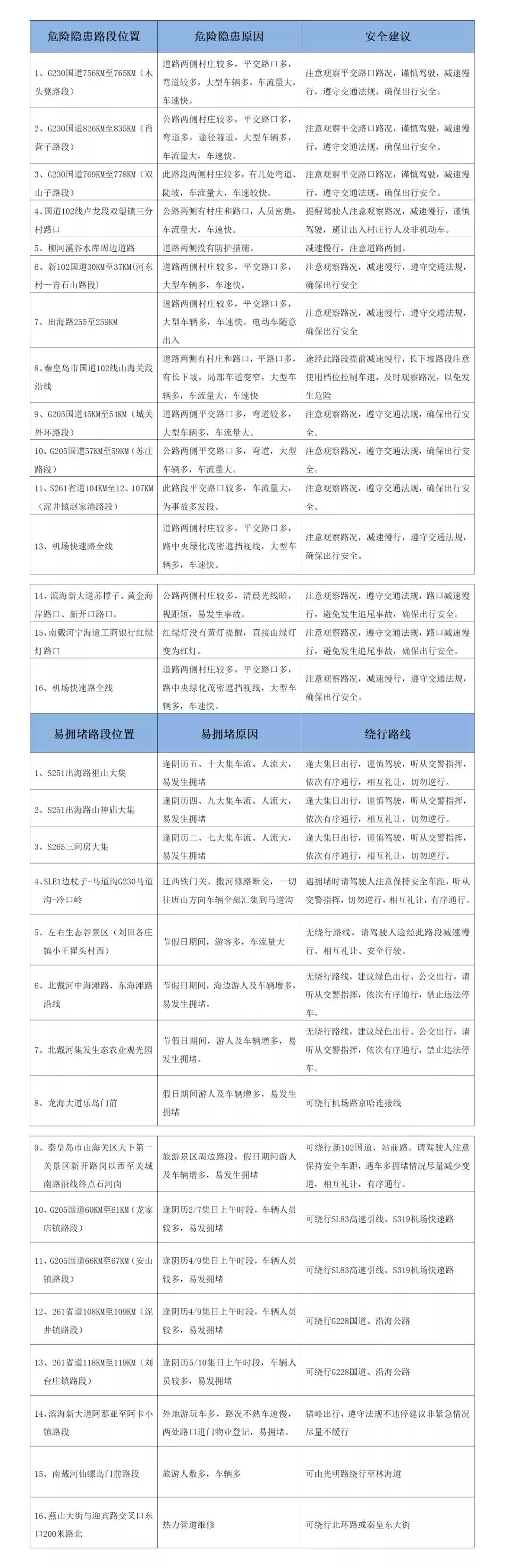 “国庆”期间客流高峰对国省道及高速公路等交通主干线交通压力将急剧增加,主干公路事故多发,我市通往景区的国省道及其他道路车流量也会大幅增多,事故也易多发,交通安全风险提升