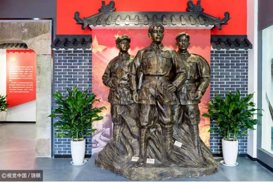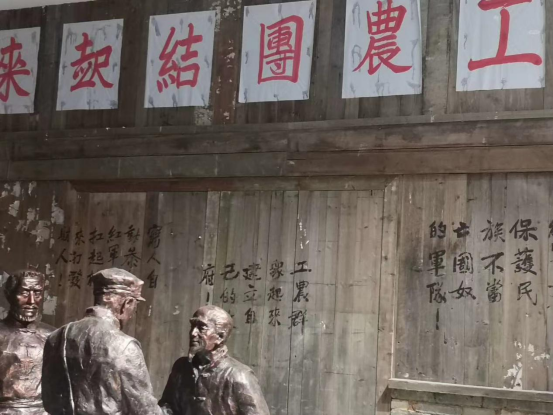▲三人雕塑,分别是匡龙海、檀炳光、檀周贵。匡龙海,曾任红十军参谋长,当时的红十军军长是方志敏。匡龙海和檀炳光直接发动和参与了留田年关暴动。