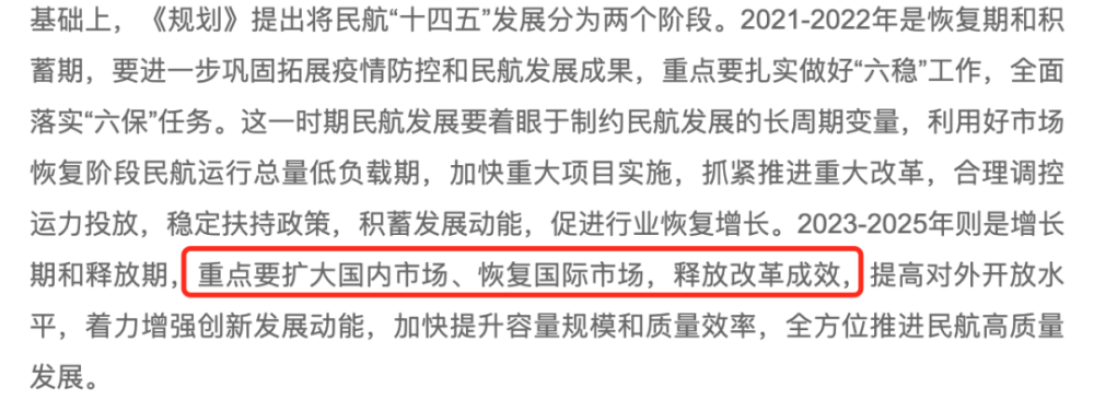 在《规划》中提出将民航“十四五”发展分为两个阶段,其中,2021-2022年是恢复期和积蓄期,也就是要促进行业恢复增长。但到了2023-2025年,则进入增长期和释放期,文中还提到了:恢复国际市场,提高对外开放水平。