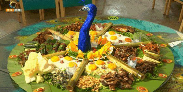芭蕉叶烤鱼,五颜六色的竹香糯米饭,充分吸收了香茅精华的烤茶花鸡、罗非鱼、冬瓜猪,油炸后的竹节虫、水蜈蚣等虫类,以及各色热带水果,犹如孔雀开屏一般铺满硕大的芭蕉叶。兼顾仪式感和内容的孔雀宴,无论你喜欢酸甜苦辣,都能在此找到各自的拥趸,不同个性的人也能在这座极尽包容的城市,解锁属于他们的快乐。
