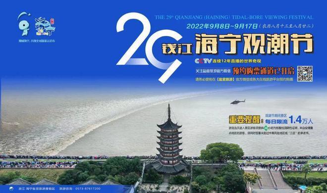 钱江(海宁)观潮节由浙江省文化和旅游厅、嘉兴市人民政府主办,海宁市人民政府承办,于每年的农历八月十四至八月二十二举行。节庆期间组织开展观潮、祭潮等系列活动,并举行盛大的民俗表演,再现海宁潮文化的风采。2000年、2010—2021年中央电视台对海宁潮以及观潮节活动进行现场直播。作为传统的节庆项目,已累计举办二十八届。今年第二十九届钱江(海宁)观潮节将于2022年9月8日—17日举行。