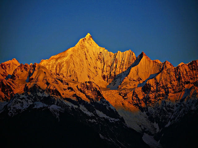 梅里雪山平均海拔在6000米以上的有13座山峰,称为“太子十三峰”。梅里雪山最美的风景是“日照金山”,但这却是可遇不可求的一件事。观赏季节是1-5月的冬春季;观赏地点一是德钦以西的飞来寺,可拍到十三峰全景;二是明永冰川上的太子庙;三是松赞梅里酒店。
