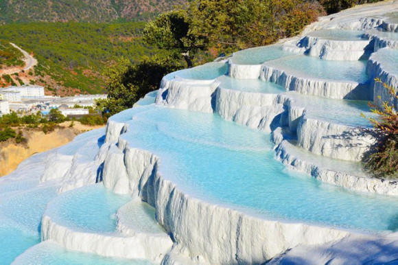白水台位于哈巴雪山麓,是含碳酸氢钙的泉水慢慢下流,碳酸盐逐渐沉淀,长年累月就形成台幔,好似层层梯田,被称为“仙人遗田”。