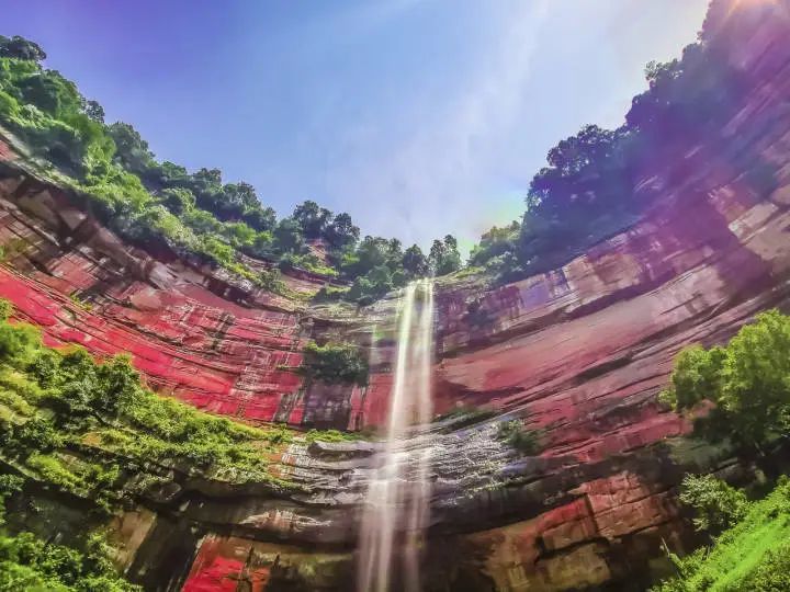 站在观景台,血红的岩壁与雪白的瀑水相互融合,赋予了赤壁灵动的活力,感受“丹霞绝壁,天下奇观”的璀璨震撼。
