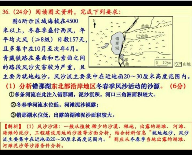 然而当人们在这里驻足游览的时候是否想过,在这个远离沙漠的地方怎么会形成如此大面积的沙地?2014全国高考卷1文综地理题有一道题,是分析青藏高原的错那湖沙化原因。