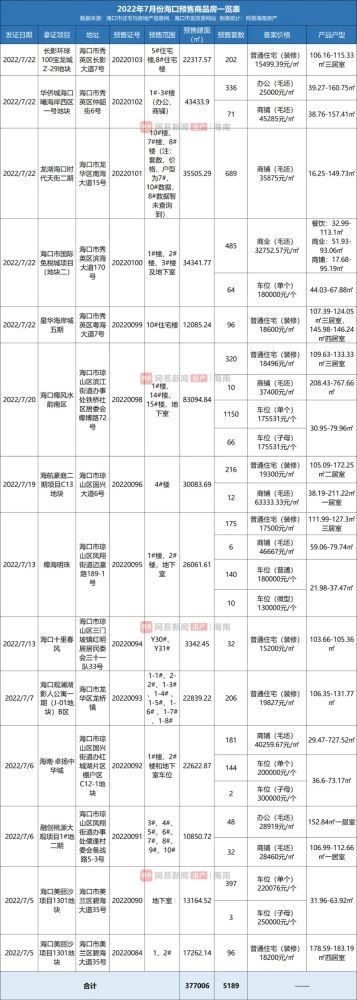 截至今日,根据海口市住宅与房地产信息网已公示的数据统计,2022年7月份,海口一共发放了14张商品房预售许可证,预售建筑面积合计37.7万㎡,环比减少24.72%;新增预售房源5189套,环比减少32.22%;其中住宅1343套,商办1870套,车位1976套。
