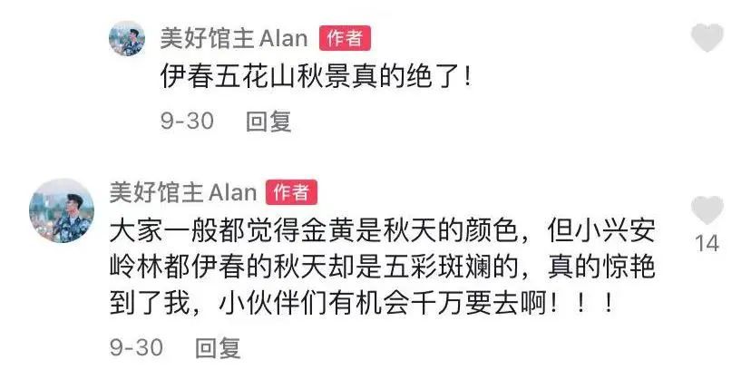 “山河已秋,愿夏日的遗憾与秋色平分,所有的望穿秋水的等待,都能有意想不到的惊喜。”在视频下,美好馆主Alan留下了这样一句评论,原以为金黄是秋的颜色,却在伊春遇见了五彩斑斓的盛放。不知道看了视频,你有没有被惊艳到呢。