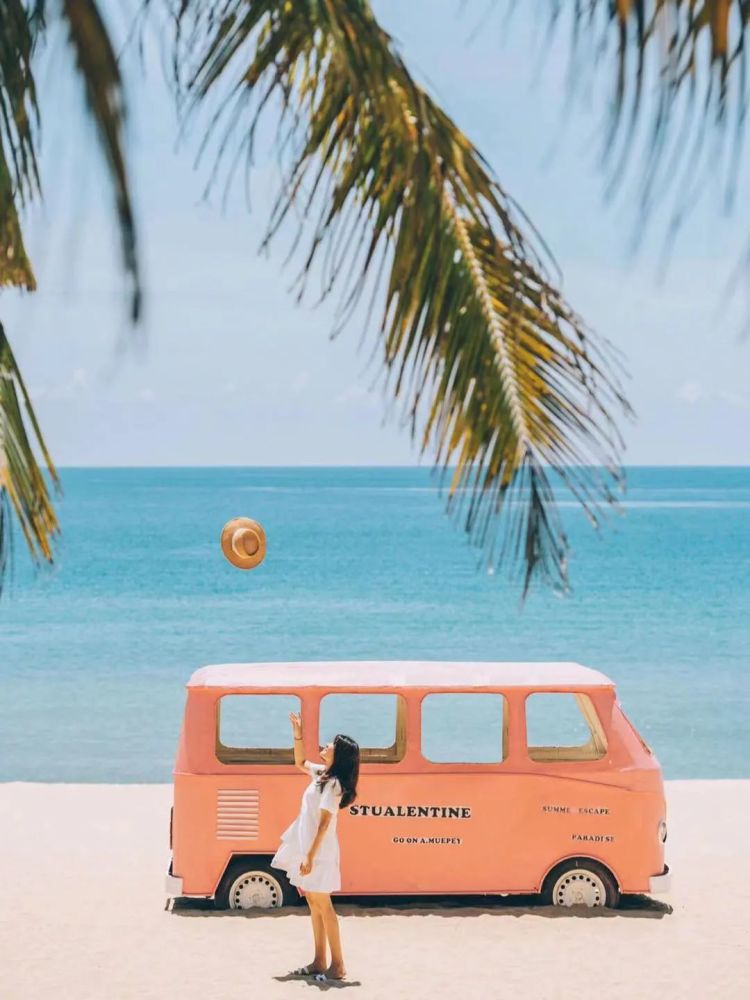 整个海滩有粉色小车、迷你巴士、海边秋千、小教堂等拍摄道具,天气好时随手一拍就是一张明信片,唯美而浪漫,是个不折不扣的拍照圣地。