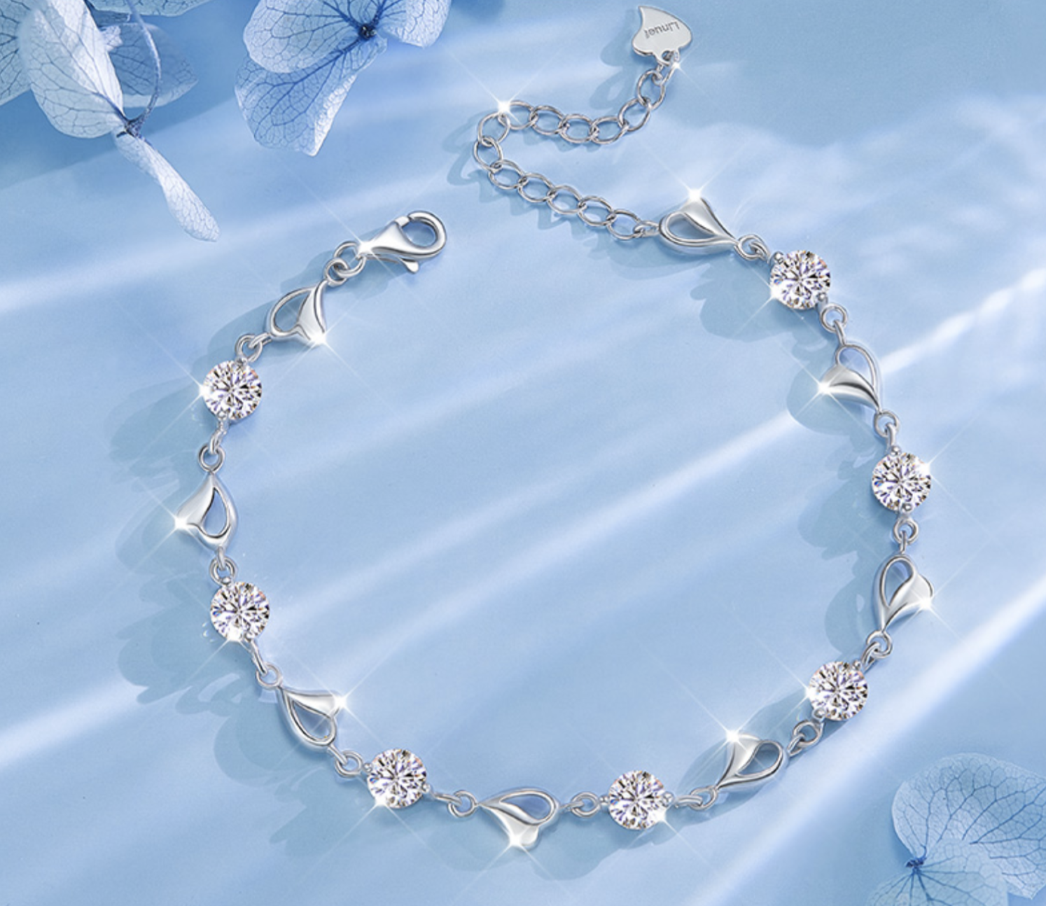 这款手链主材质为国际标准S925银,佩戴舒适不易过敏,电镀铂金光泽持久亮丽;上面镶嵌着7颗施华洛世奇锆钻,八心八箭切工,57个独立切面,多维度的折射出光芒。