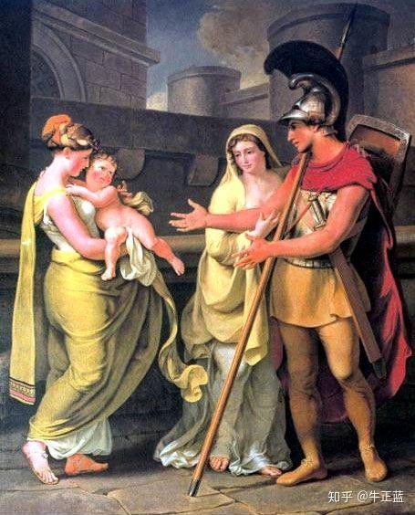 身披铠甲的赫克托尔与逃离的儿子他把手伸向孩子,孩子惊呼,躲进腰带柬得很好的保姆的怀抱,他怕看父亲的威武形象,害怕那顶铜帽和插着马鬃的头盔,在他看见那鬃毛在盔顶可畏地摇动时。他的父亲和尊贵的母亲莞尔而笑,那显赫的赫克托尔立刻从头上脱下帽盔,放在地上,那盔顶依然闪闪发光。他亲亲亲爱的儿子,抱着他往上抛一抛,然后向着宙斯和其他的神祷告说:"宙斯啊,众神啊,让我的孩子和我一样在全体特洛亚人当中名声显赫,孔武有力,成为伊利昂的强大君主。日后,他从战斗中回来,有人会说:“他比父亲强得多。” ——伊利亚特 Ⅵ铠甲是父亲社会属性的象征,身着铠甲就难以亲近孩子,亲近孩子就要退掉铠甲。父亲是爱孩子的,但他的爱和母亲不同,母亲源自生物本能的爱孩子,而父亲对孩子的爱充满了距离感,只能身披铠甲提供“有隔阂的拥抱”。人类社会早期,人只知其母,不知其父。母亲是天然的母亲,而父亲是人类社会发展到一定程度的产物。