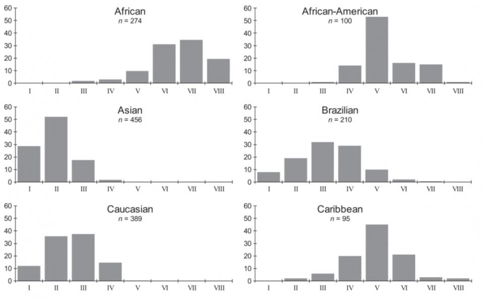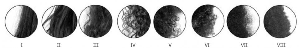 据研究,在欧洲人群(高加索人)中,只有12% 的人有纯粹的直发,36% 有等级2的卷发,38%有等级3卷发,剩下的都是等级4的卷发;亚洲人群中,约29%的人有直发,最多为等级2的卷发约51%,剩下的为16%的等级3卷发和2%的等级4卷发;而非洲人大多数都是等级5以上的卷发,详见图表: