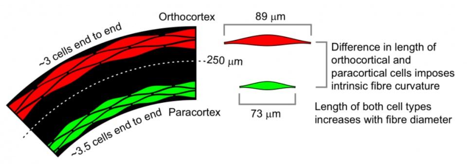 Harland D P, Vernon J A, Woods J L, et al. Intrinsic curvature in wool fibres is determined by the relative length of orthocortical and paracortical cells[J]. Journal of Experimental Biology, 2018, 221(6): jeb172312.
