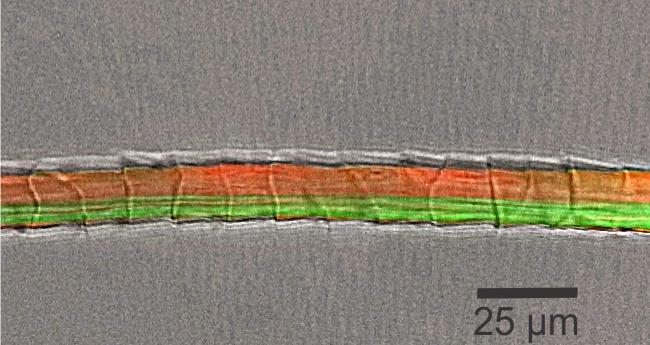 △ 染色显示纤维状的正皮层细胞(橙色)和副皮层细胞(绿色) 图源:AgResearch Ltd