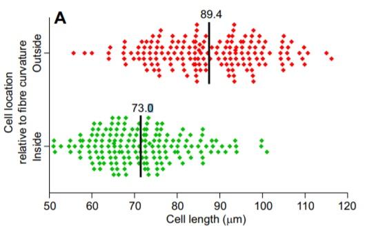 之后,这些纤维被切成均匀的碎片,利用静电力把它们移动到载玻片(一种玻璃片)上,对这些样本的片段进行染色,最后在显微镜下观察。测量出每个纤维的平均曲率,然后放大到曲线上精确点的细胞结构。