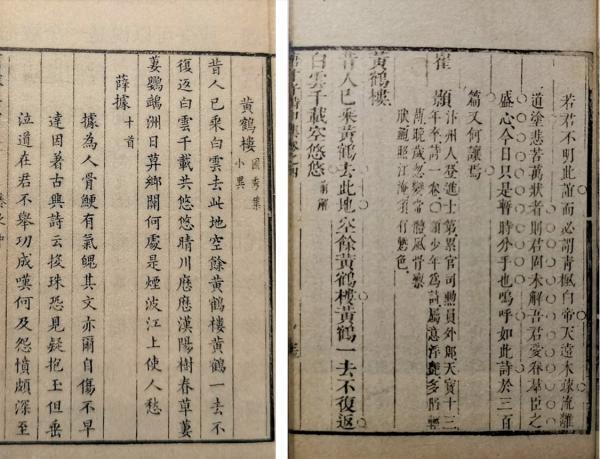 《黄鹤楼》首句“白云”与“黄鹤”的争论,由来已久。图左为唐代殷璠编纂《河岳英灵集》,图右为清初金圣叹选批《贯华堂选批唐才子诗》。