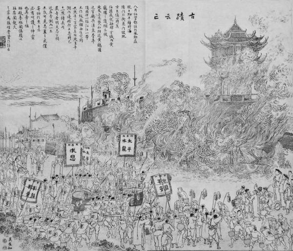 光绪十年(1884年),黄鹤楼(同治七年建成)被大火烧毁。图为《点石斋画报》:《古迹云亡》。