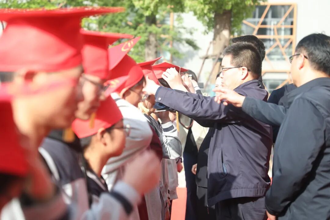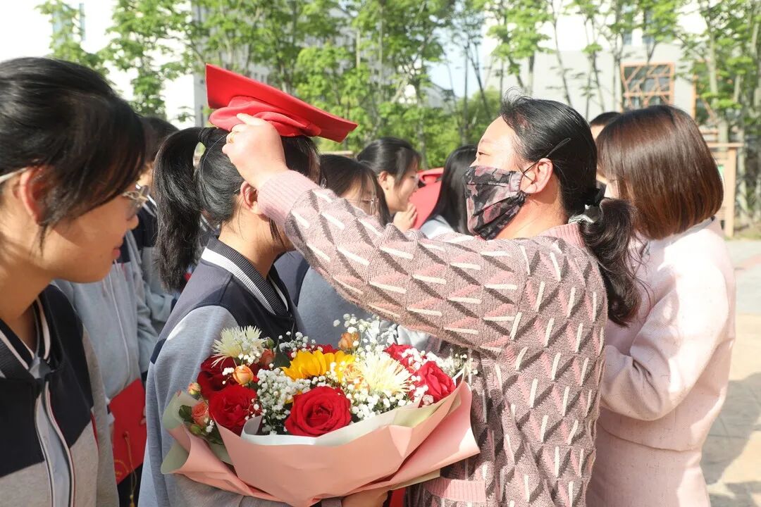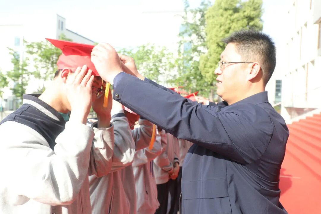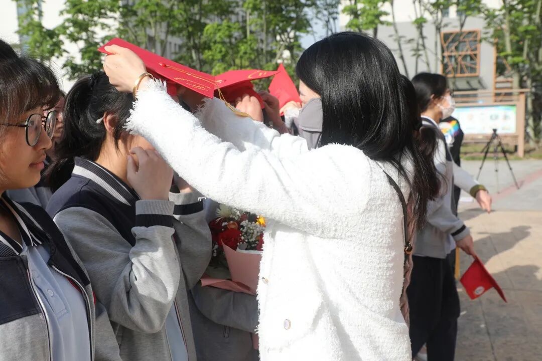 泗洪姜堰高级中学校领导为学生代表佩帽、拨穗,高三各班主任、老师及部分家长为高三学生佩帽、拨穗。红色的成人帽汇成红色的海洋,成人帽下洋溢着同学们自信而开朗的笑容。