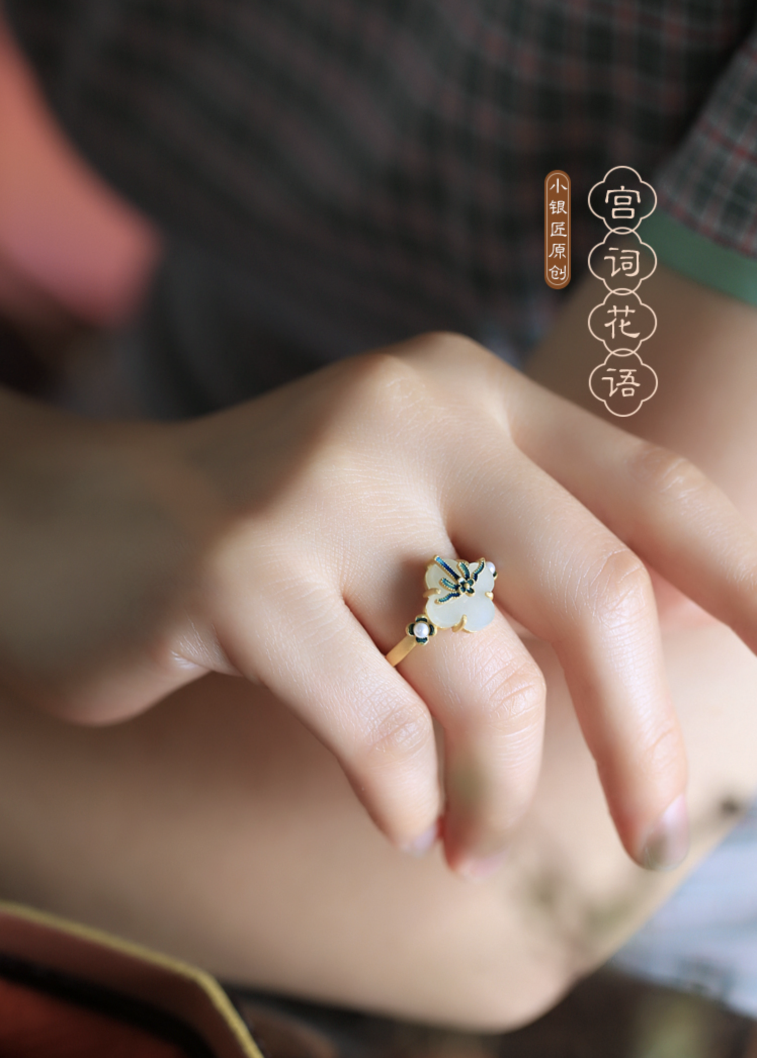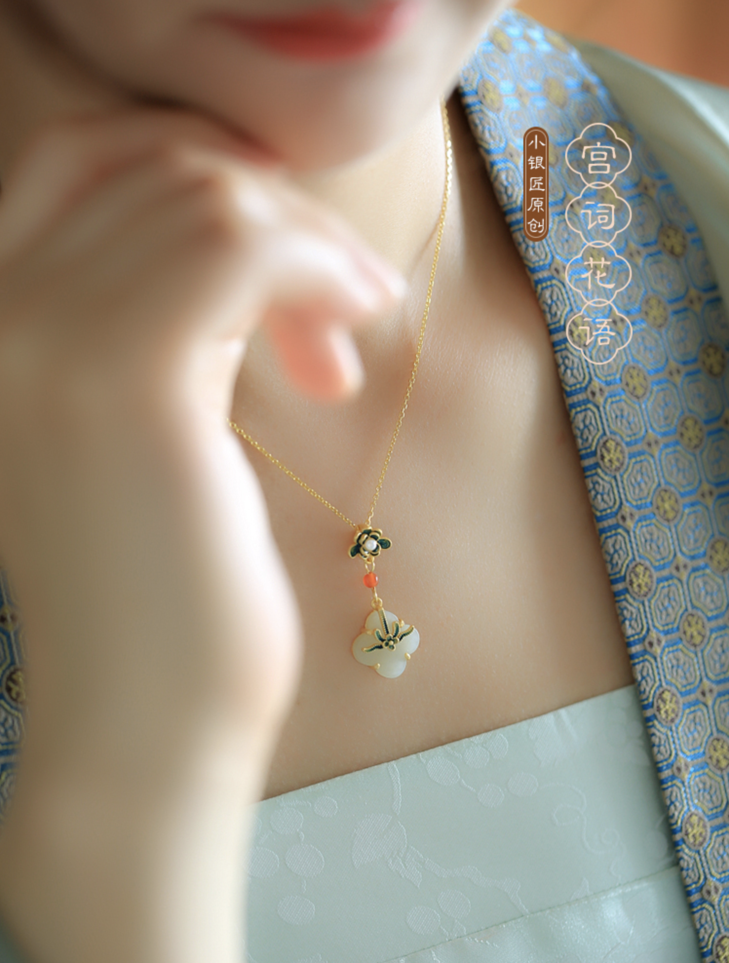 以复古花枝为元素,结合了鎏金、珐琅、点翠工艺,使得整件饰品上身更显温婉大气。