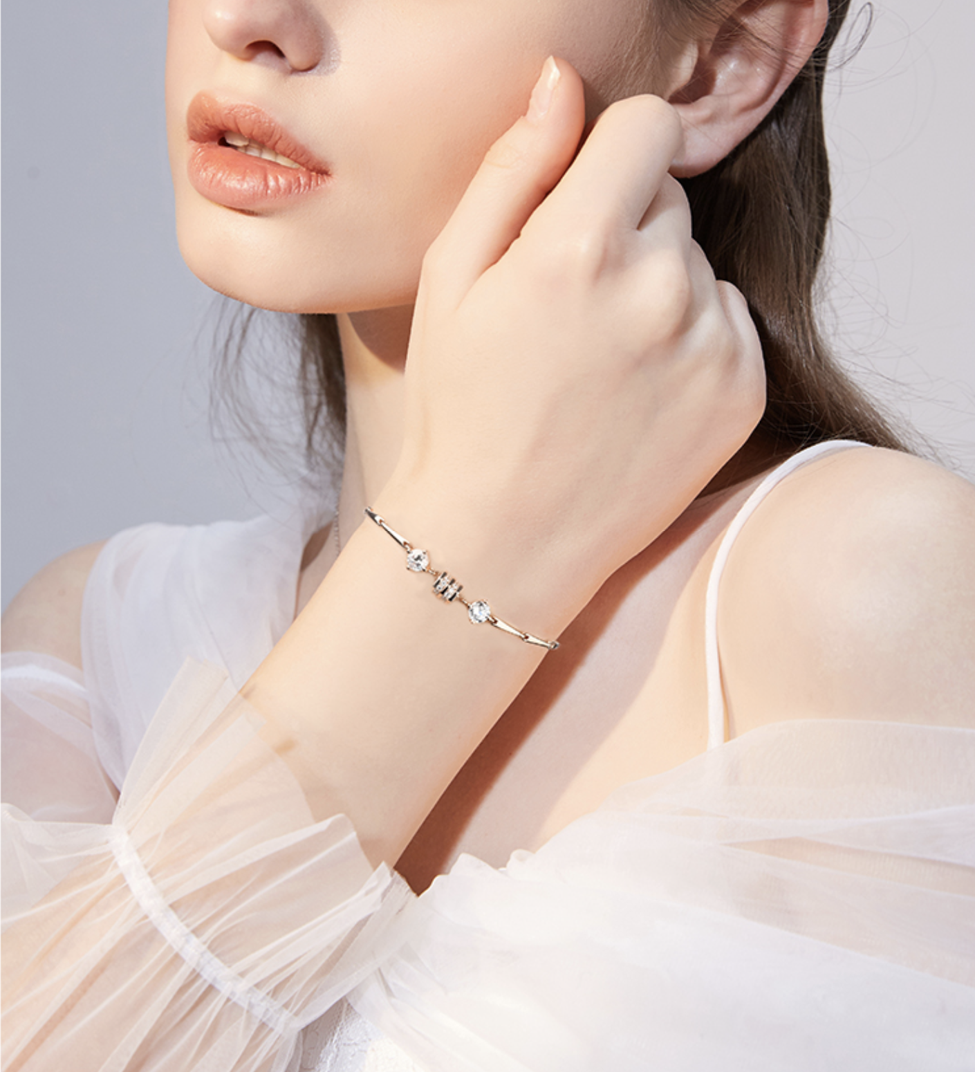 这款手链主材质为国际标准S925银,佩戴舒适不易过敏,电镀铂金光泽持久亮丽;上面镶嵌着7颗施华洛世奇锆钻,八心八箭切工,57个独立切面,多维度的折射出光芒。