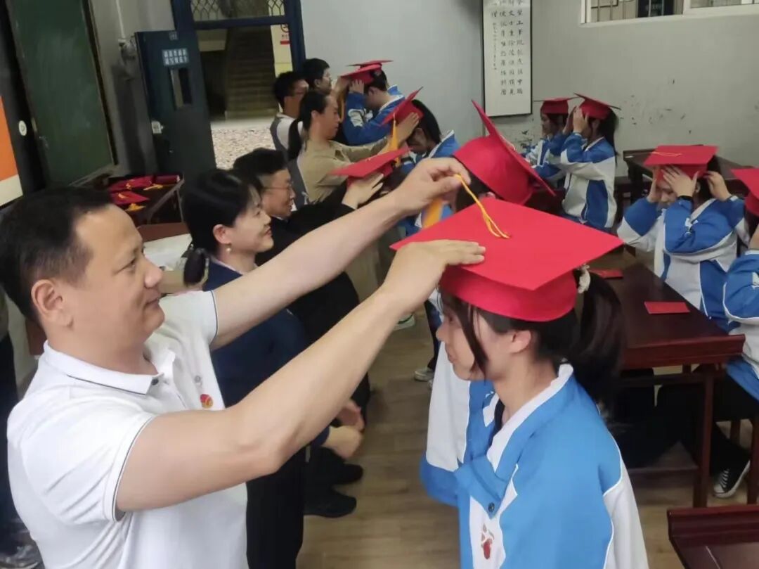 最激动人心的环节便是学校领导和老师为学生正冠拨穗和颁发《中华人民共和国宪法》,全体同学向师长行成人礼,师生共同见证最庄严、最美好的时刻。