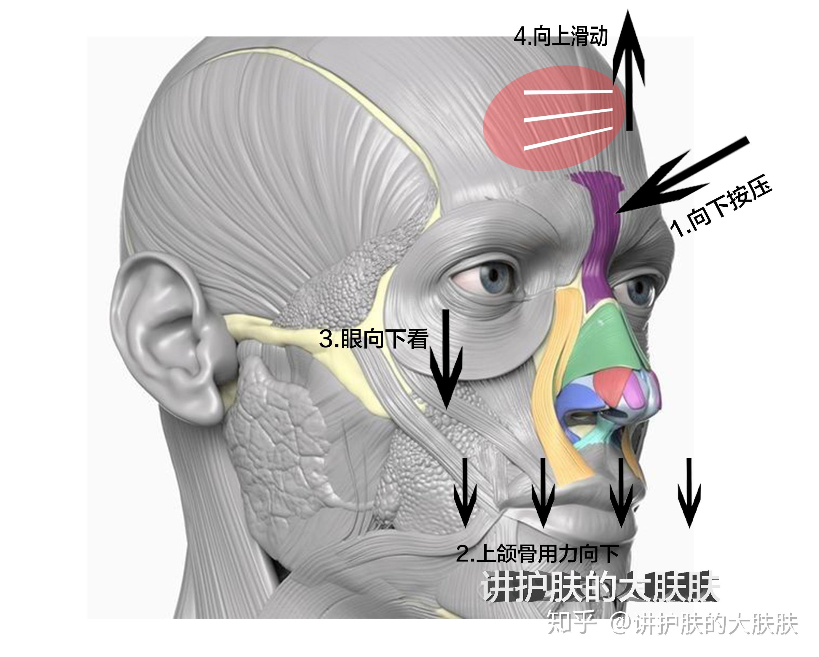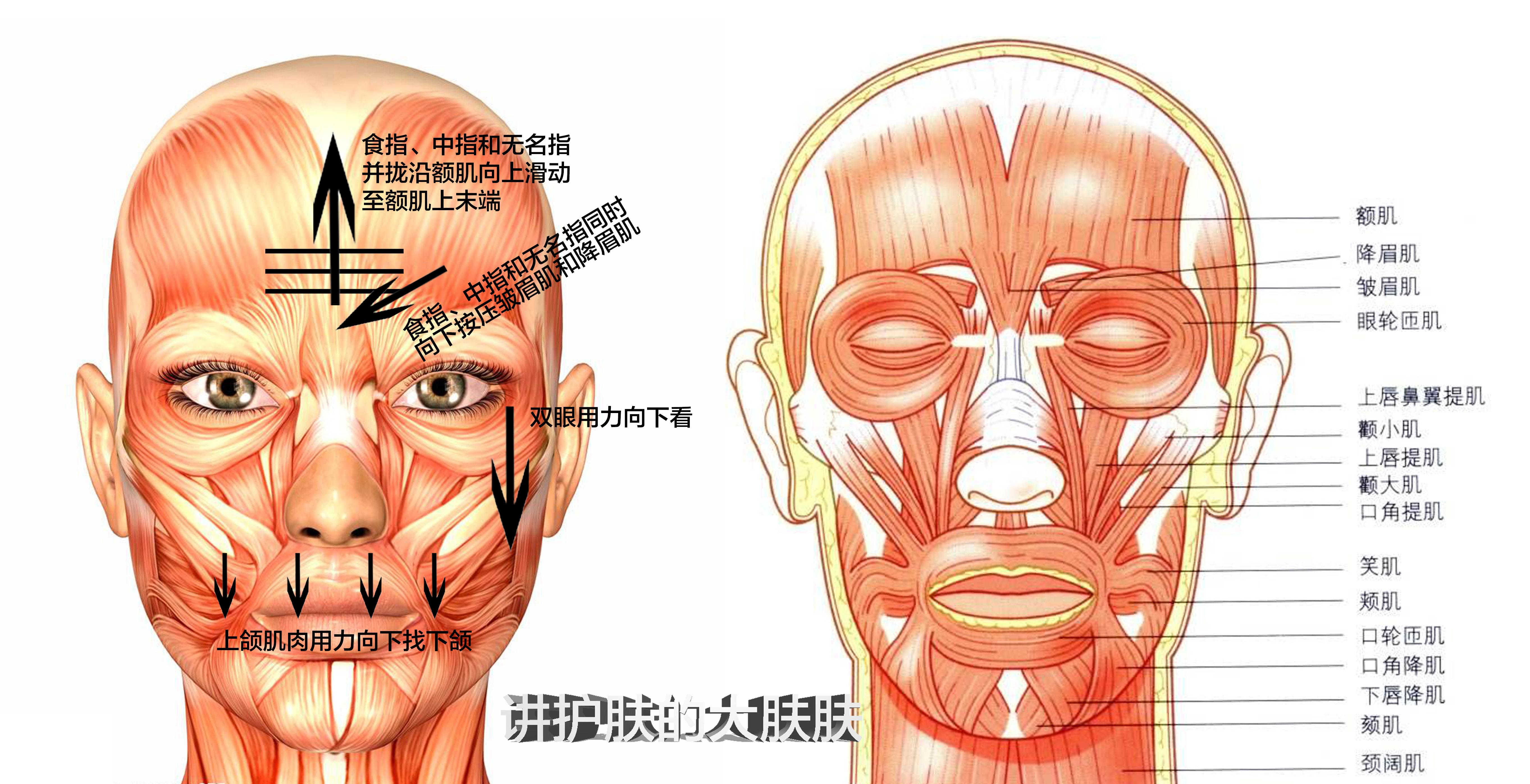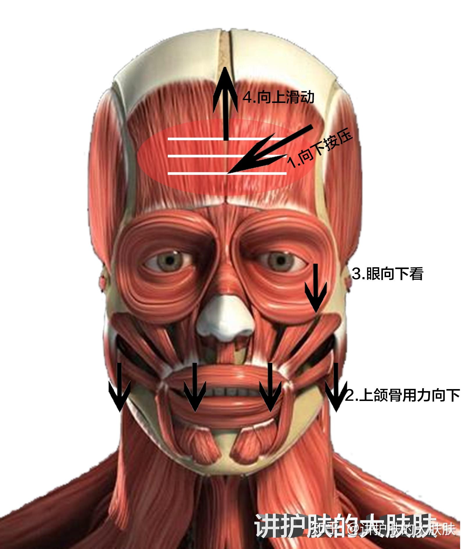 呼气的同时两眼向下看,上颌肌肉用力向下找下颌,并拢的食指中指无名指向上方滑动至额肌的上末端。