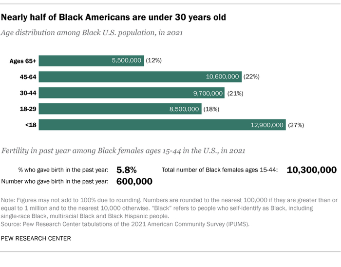 更值得注意的是,美国黑人人口非常年轻。2021年美国黑人中位年龄为33岁,白人中位年龄58岁,近一半黑人人口年龄在30岁以下。