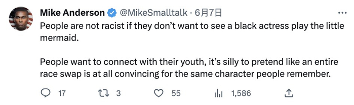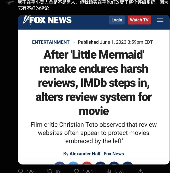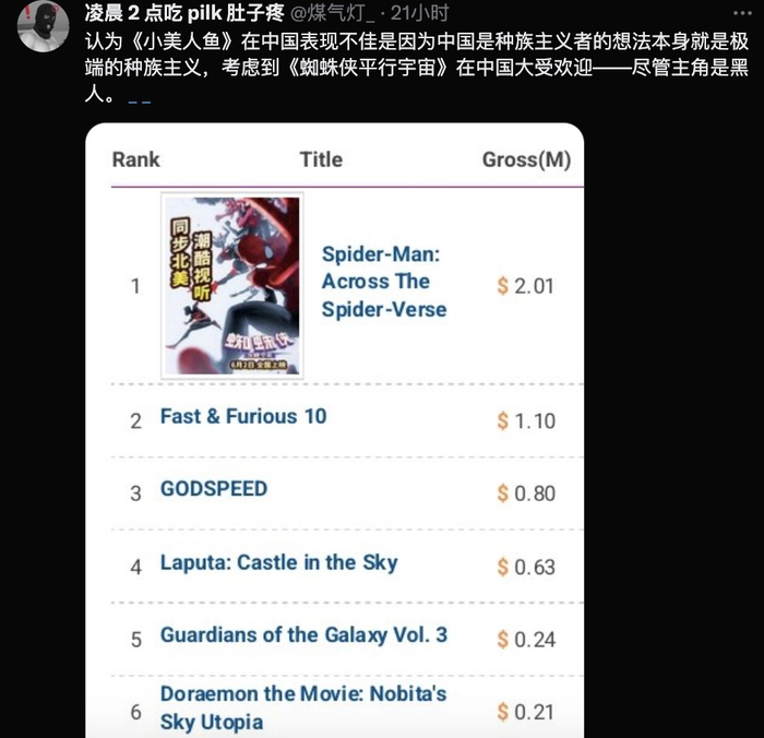 所以在北美大茧房里,美国观众很难理解为什么中国人这么不待见《小美人鱼》,思来想去,还是国内的斗争路径最熟悉——无他,种族主义。