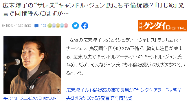 据日媒6月16日报道,广末凉子的丈夫井筒顺(Candle JUNE)疑似也有婚外情,而且应该是出轨在先,与多名女性有染。