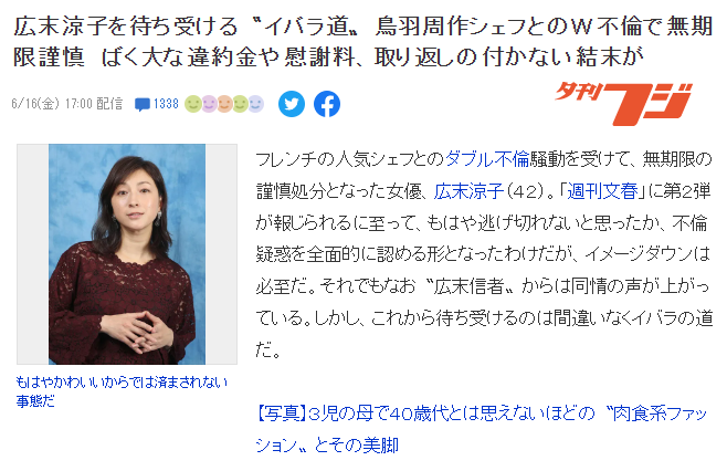 井筒顺一直没有回应广末凉子出轨一事,之前曾表示“不做评论”,曾在6月11日出席纪念地震的活动,发表了一番意味深长的话:“我的家人遇到了困难,我会好好做个了断。”