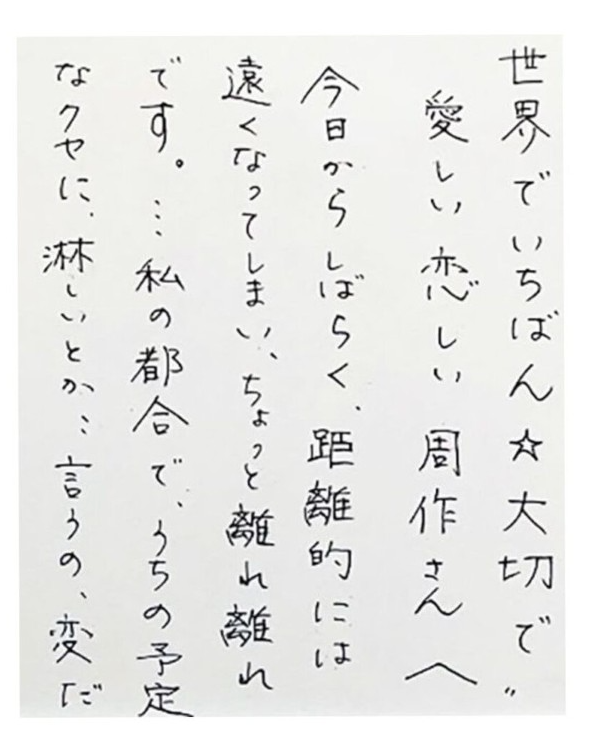 《周刊文春》还曝光广末凉子与鸟羽周作的情书,她说感谢男方无条件的陪伴,是让她第一次那么认真爱的人,幸福到想哭,相处方式让她很舒服。