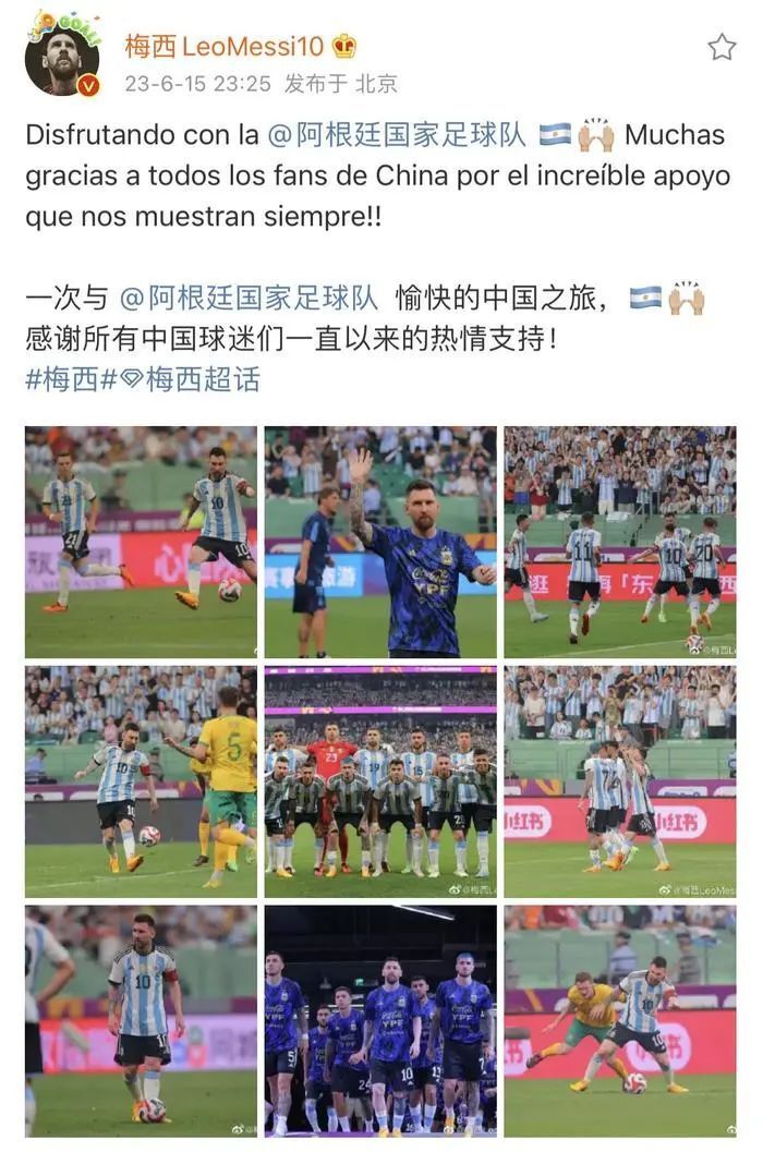 赛后,阿根廷球星梅西在微博发文,感谢中国球迷的支持。“一次与阿根廷国家足球队愉快的中国之旅,感谢所有中国球迷们一直以来的热情支持!”梅西写道。