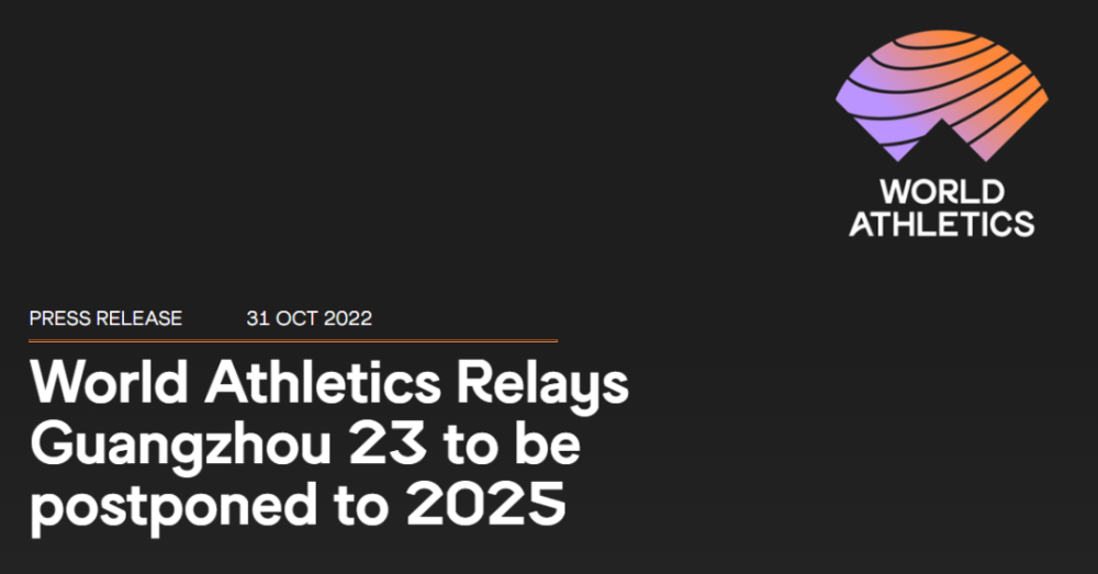 11月1日消息,世界田联官方宣布,原定于2023年5月举行的第23届广州世界田径接力赛推迟至 2025年4月/5月(具体日期待定)。这也是继室内世锦赛之后,又一项在中国举办的田径大赛延期举办。