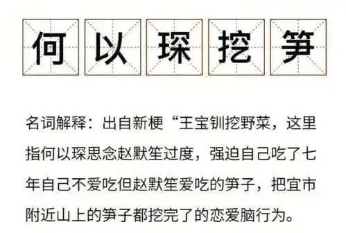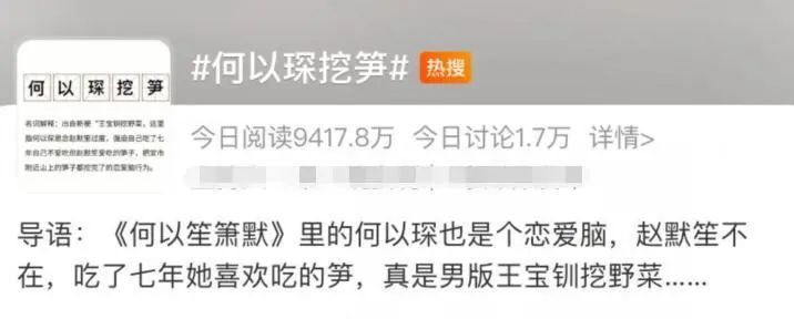 《何以笙箫默》中的男主何以琛也被网友发现恋爱脑,前有“王宝钏挖野菜”,后有“何以琛挖笋”,这里指的是何以笙因为思念赵默笙过度,强迫自己吃了七年自己不爱吃但赵默笙很爱吃的笋,被网友称为男版王宝钏挖野菜。