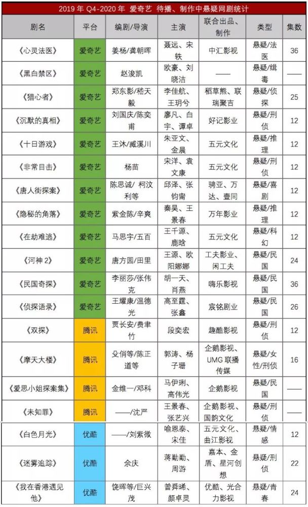 目前,优爱腾曝光的待播、制作中的悬疑剧超过20部,其中不乏台前阵容、幕后班底,以及原著影响力俱佳的项目。