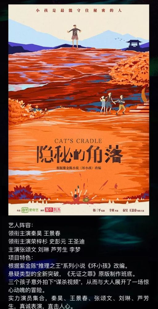 这个招商季曝光的悬疑网剧项目中,《无证之罪》的原著作者紫金陈成了抢手资源。他的“推理三部曲”的另外两部,都被看中改编——分别是廖凡、白宇主演的《沉默的真相》(改编自《长夜难明》),紫金陈亲自担任编剧的《隐秘的角落》(改编自《坏小孩》)。